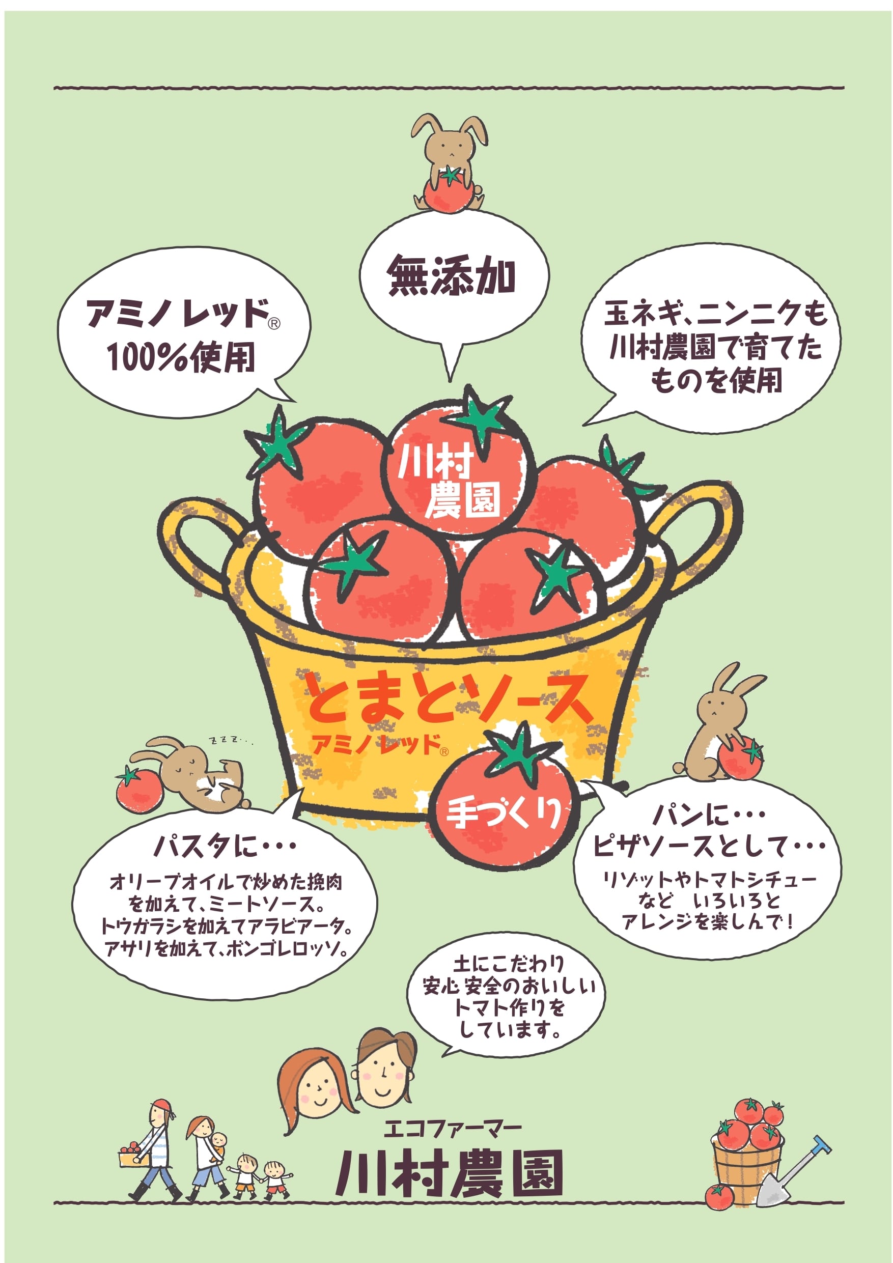 川村農園のトマトを、玉ねぎやニンニクと一緒にじっくりと煮込んで作った自信作です。